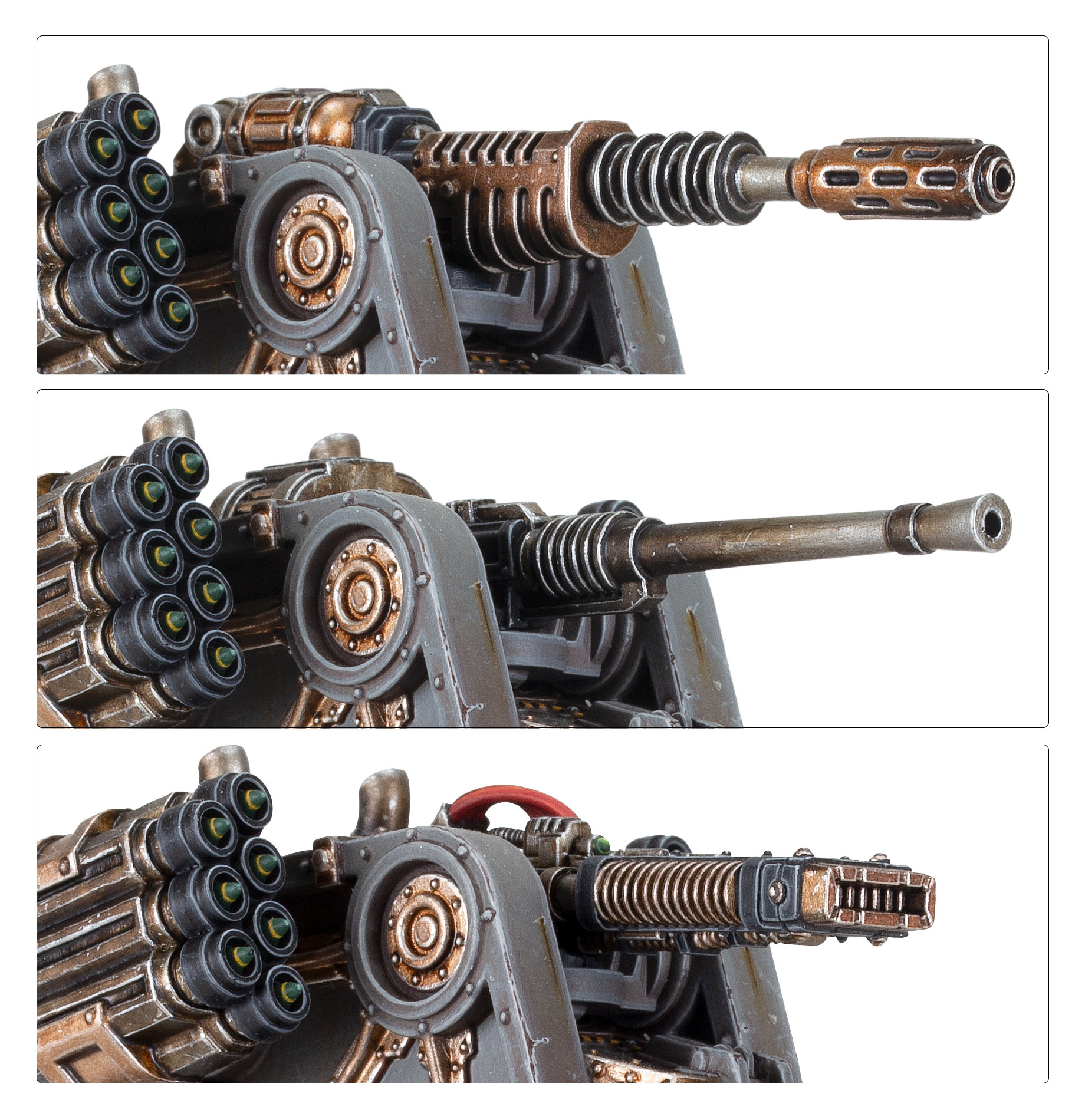 This multipart plastic kit builds one Aethon Heavy Sentinel, an armoured combat walker for the Solar Auxilia. The Sentinel comes with an arsenal of heavy weaponry, and can be armed with one of six dorsal guns – a volkite culverin,