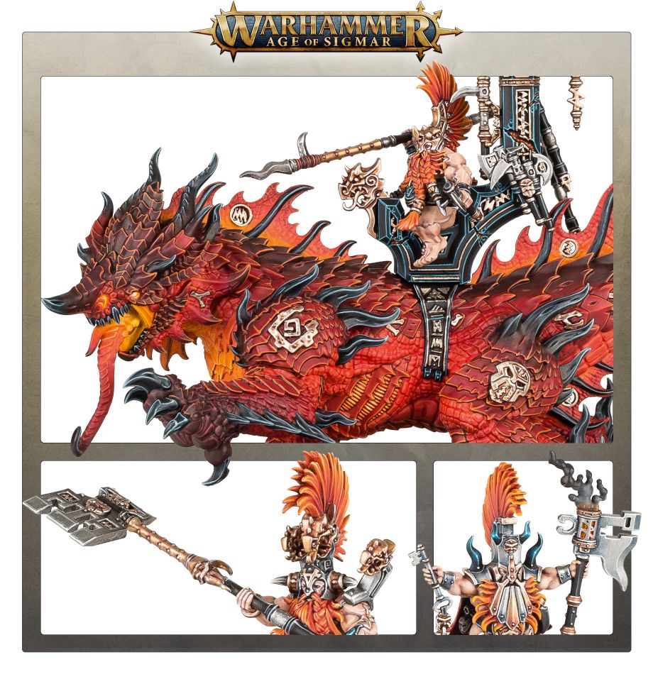 Auric Runesons are hot-headed young Fyreslayer nobles, eager to prove their worth to the lodge by hunting and slaying the most powerful foes in the name of Grimnir. Mounted on a Magmadroth with a lethal, whipping tail and super-heated breath, a Runeson charges into battle like a blazing fist, ready to burn a flaming hole in the ranks of the enemy.