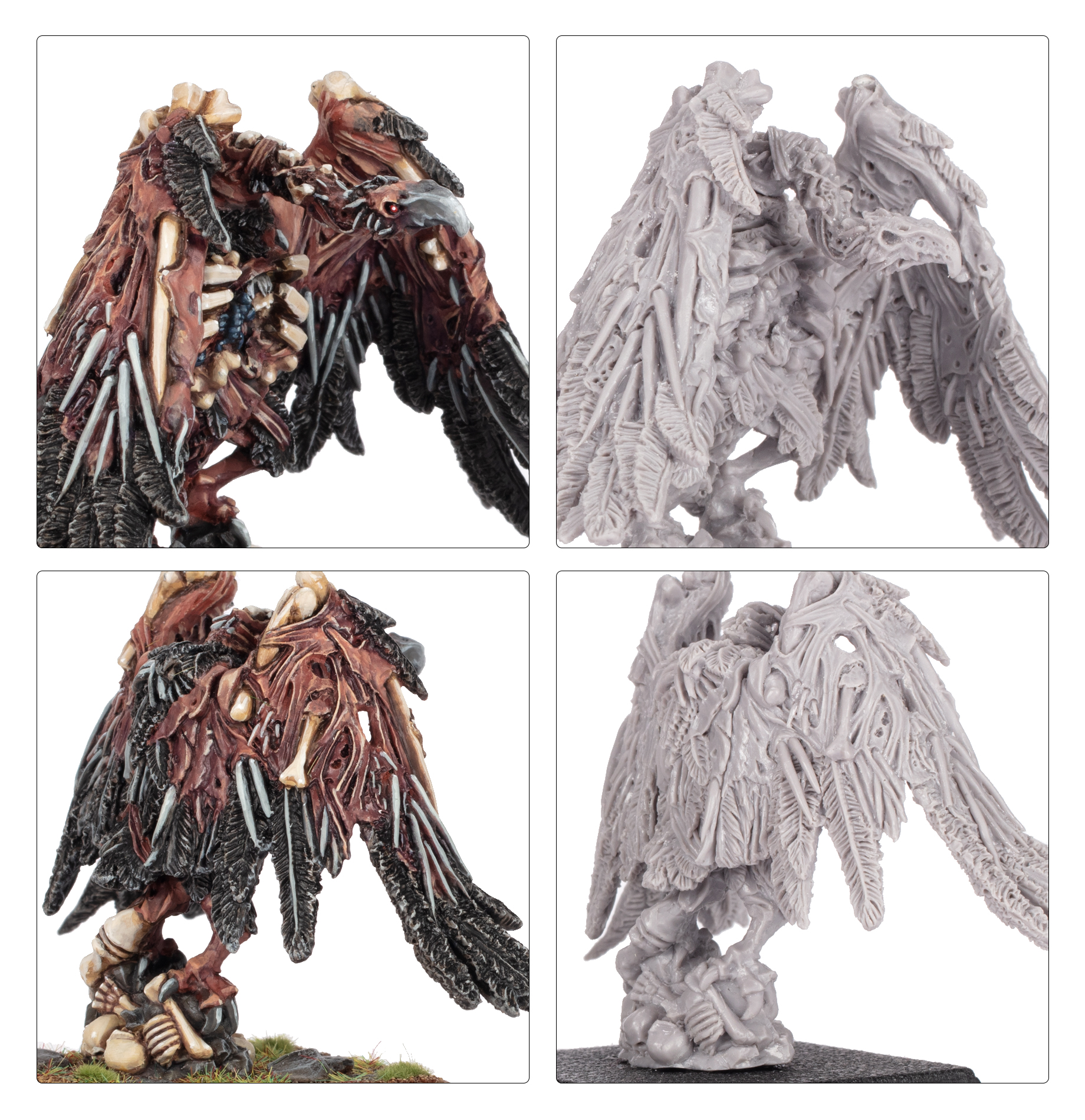 This multipart resin kit builds three Carrion, monstrous undead birds that accompany the Tomb Kings of Khemri. These foul scavengers are covered in ragged feathers, exposed bones, and mummified flesh, but their vicious beaks and talons remain deadly enough to