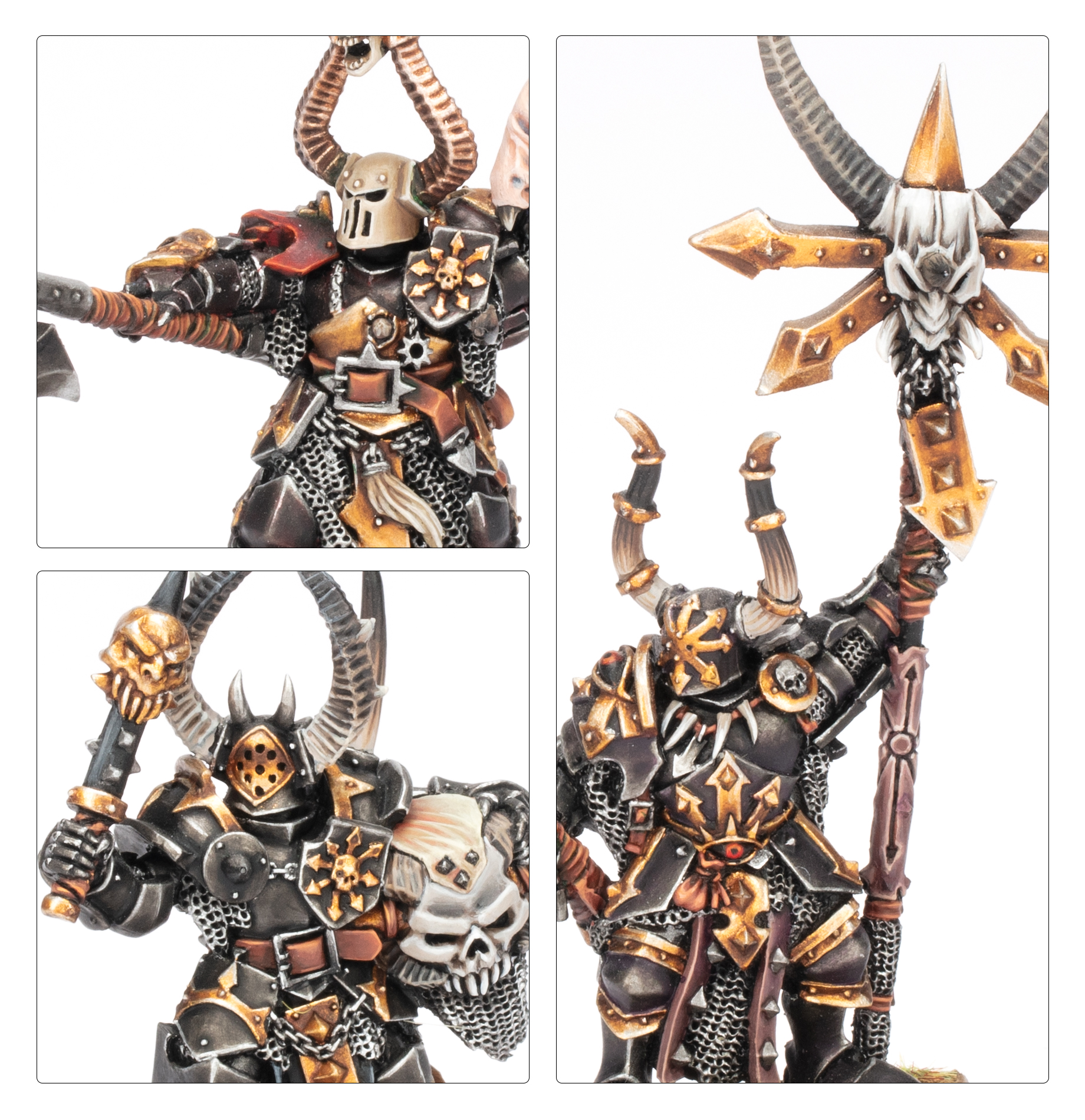 There are those amongst even the elite ranks of Chosen Chaos Warriors who bear the favour of the Dark Gods more so than their fellows. This swelling of power helps champions rise up and seize command of entire units of like-minded killers. These deadly troops are whipped up into further frenzy by the booming beat of musicians and standard-bearers raising banners of Chaos.