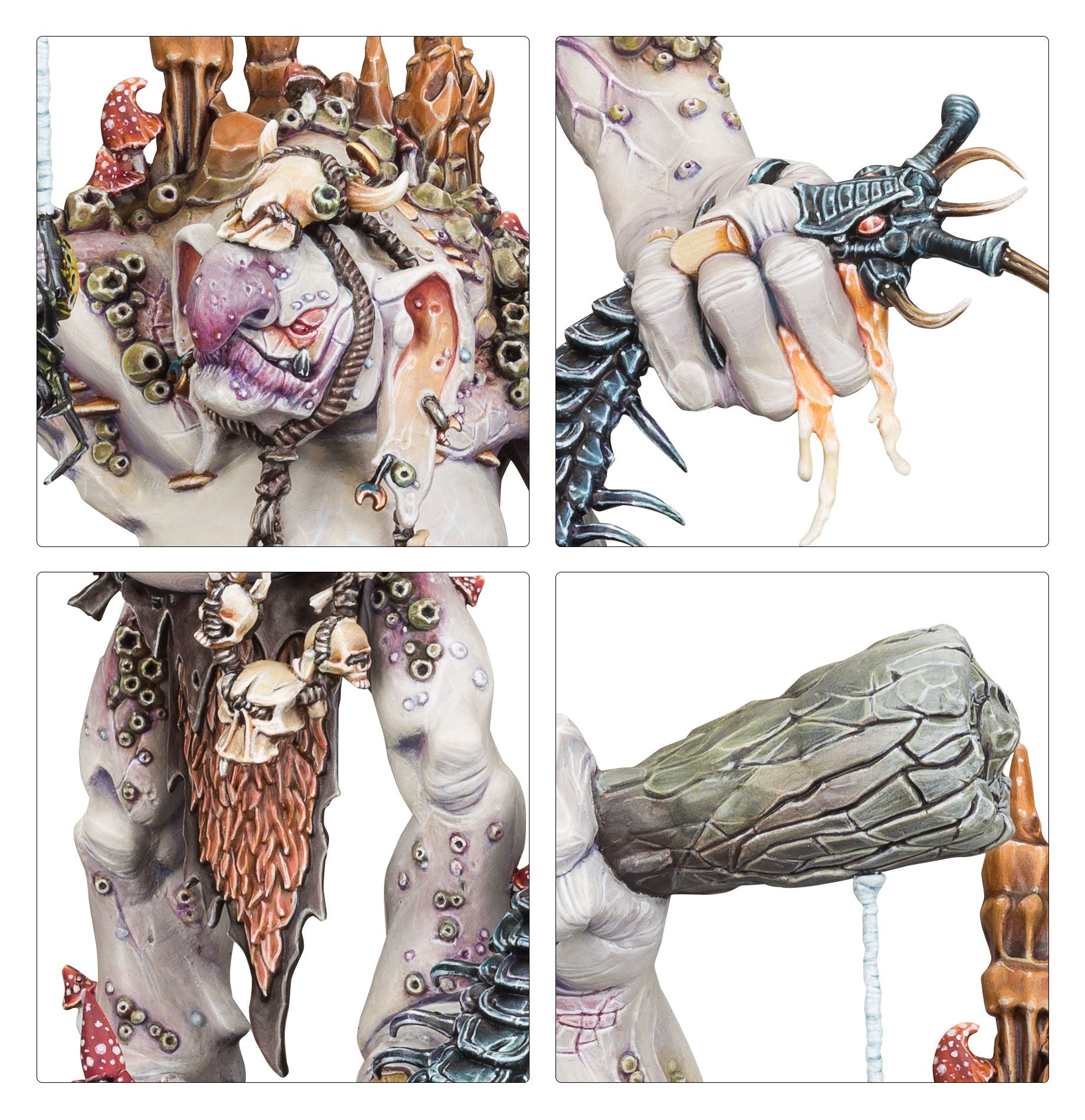 Dankhold Troggbosses are ancient creatures, their bodies encrusted with jagged stalagmites, unnatural fungi, and slime-coated growths. When such beasts wake from their subterranean slumber, the resulting rampage draws herds of troggoths to fight in their shadow, galvanised by the Troggboss’s primeval authority and demanding bellows.