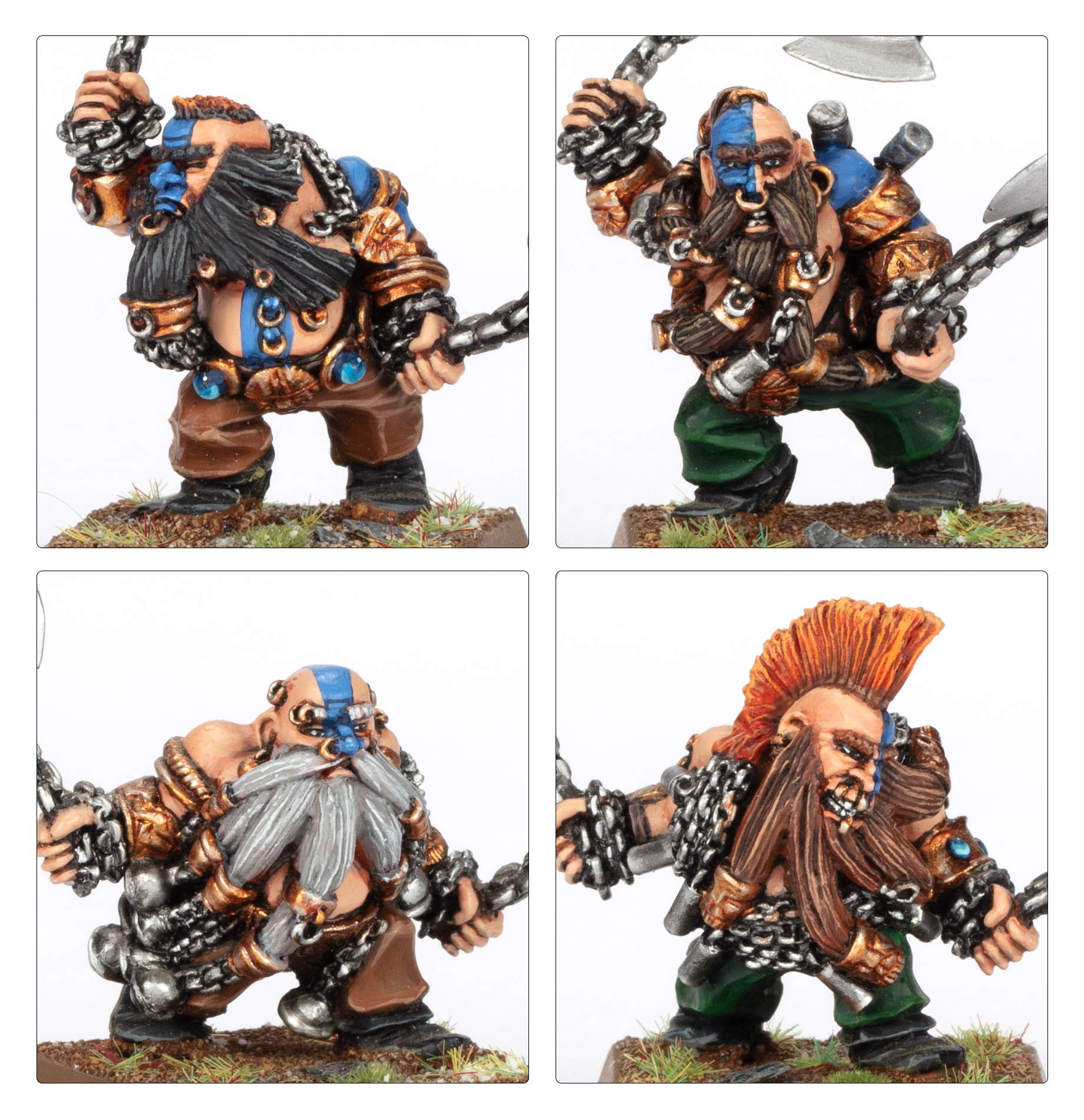 This multipart metal kit builds four Doomseekers – Mercenary units for Dwarfen Mountain Holds armies in Warhammer: The Old World. Doomseekers fight alone and are covered in tattoos and runic symbols to help ward off magical attacks. They are each armed with the hideous