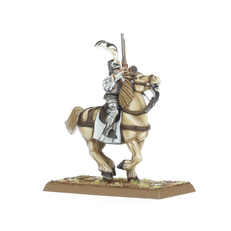 Pistoliers act as light cavalry who gallop around the enemy flanks, disrupting formations, and launching devastating hit-and-run attacks with their pistols blazing. Equipped from the opulent armouries of their noble families, each Pistolier cuts a dashing figure with their flamboyant livery, plumed helmet, and brace of pistols.