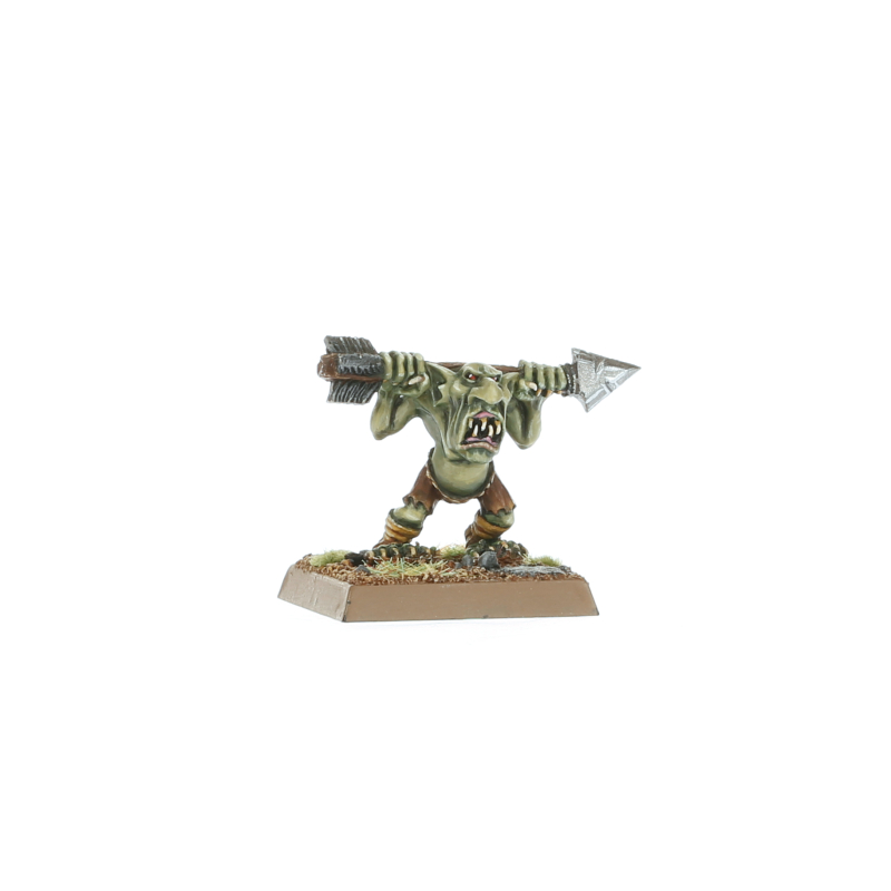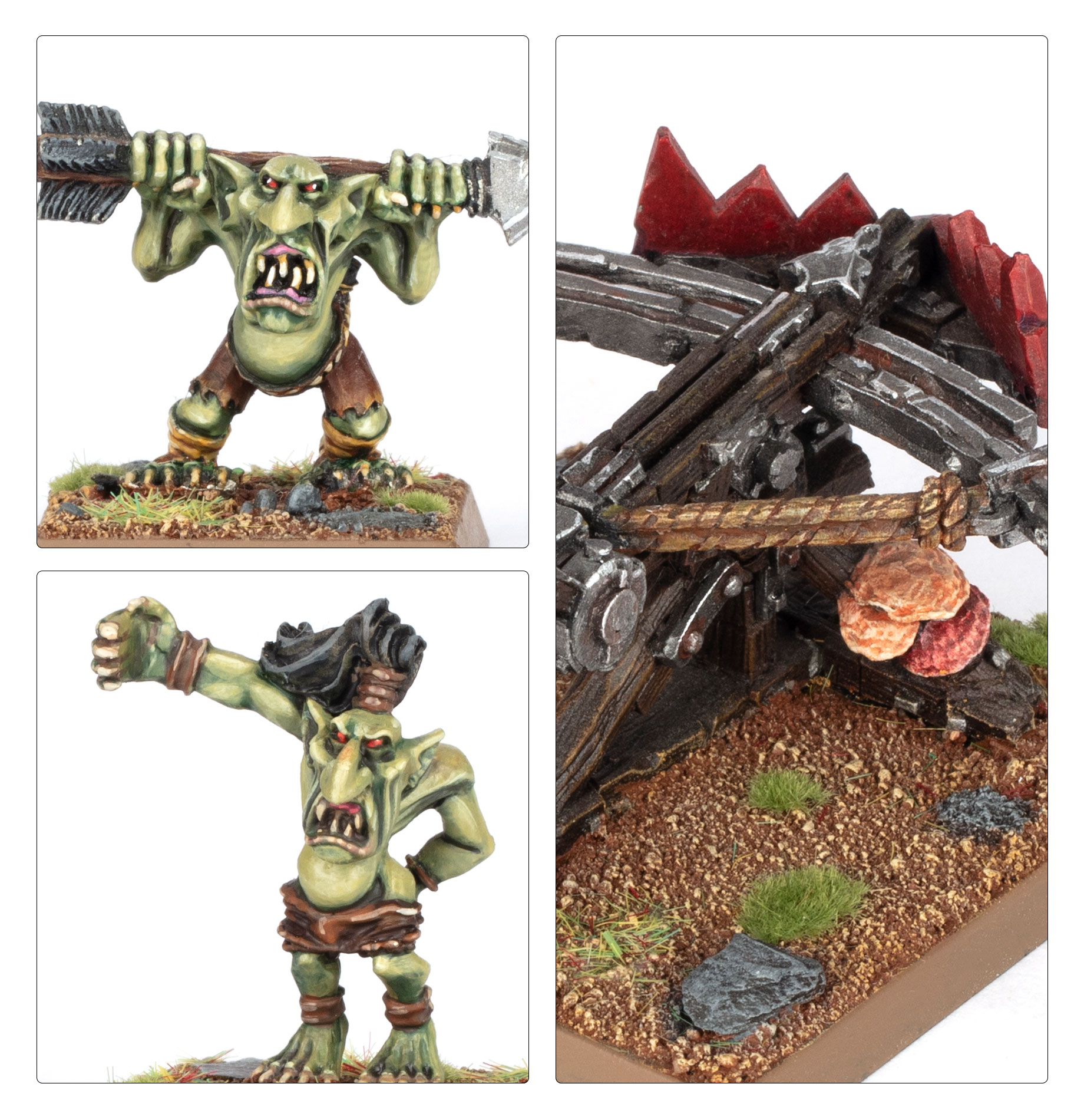 This multipart metal kit builds one Goblin Bolt Throwa with 3 Goblin crew. The Bolt Thrower itself is depicted primed and ready to unleash its deadly ammunition.