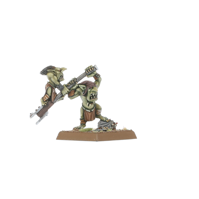 This multipart metal kit builds one Goblin Rock Lobber, with 3 Goblin crew and 1 Orc Bully to keep the goblins in line. The Rock Lobber itself is depicted as being primed by another goblin, with a beady-eyed spotter sat on top.
