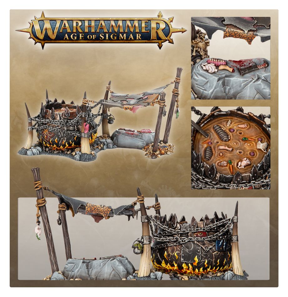 This piece of terrain brings a number of benefits to an Ogor army. Any enemy models slain nearby can be thrown into the pot and cooked into a restorative broth that heals Mawtribe units. It’s also a vessel of the Gulping God, helping your nearby Wizards