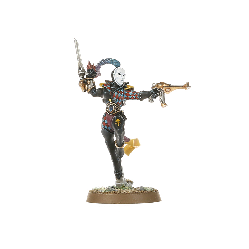 Harlequin Troupes perform with breathtaking skill, whether their stage is a wraithbone and glass amphitheatre bathed in crystalline light or the firelit hell of the battlefield. They tumble, sprint, and leap with supple agility, every squeeze of a trigger and slash of a blade bringing death to the enemy.