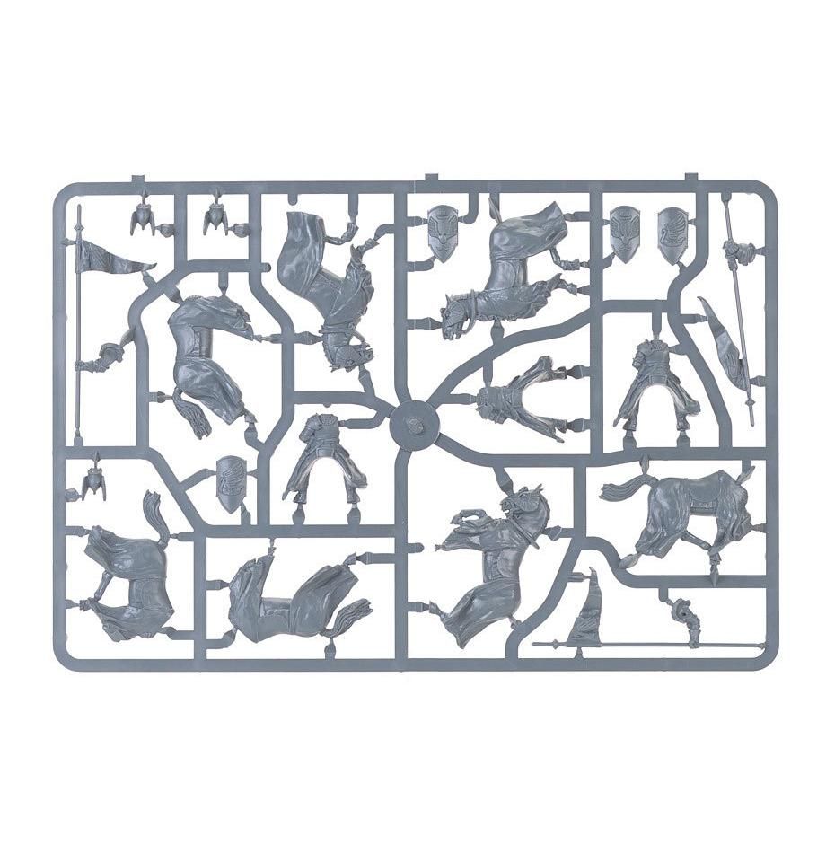 This box set contains six plastic Knights of Dol Amroth. This 39-piece set includes: five different head designs, five variations of lance arm, three designs of shield, three variations of horse, a banner with sculpted detailing and a trumpet arm. Models supplied with 40mm round bases.