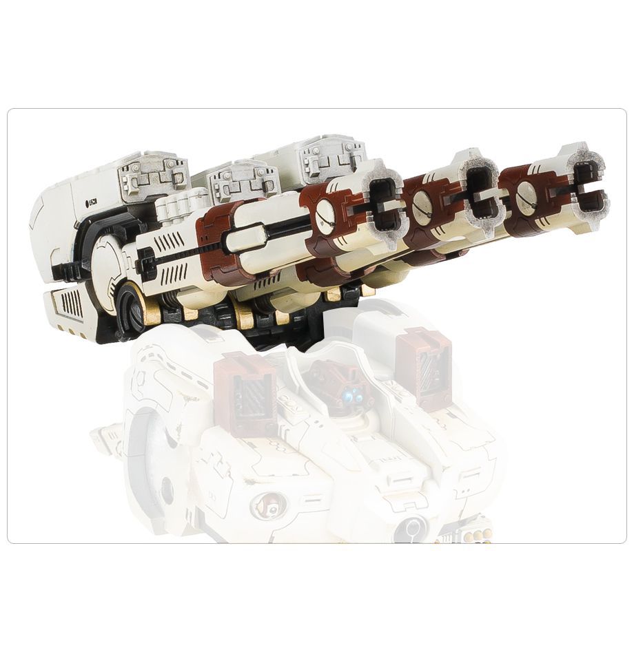 A recent development of T’au pulse technology, this triple-barrelled Pulse Ordnance Multi-driver uses powerful induction fields to propel a variety of heavy munitions with great force and precision. Fired in rapid volleys, this mix of high explosive and kinetic projectiles can be used to either saturate a single target with concentrated bombardments, or shower a wider area with arcing trajectories to equally devastating effect