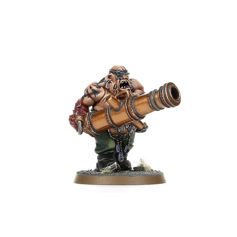 Leadbelchers are generally regarded as unhinged by most other Ogors, but also highly entertaining. They are obsessed with destruction and noise, and arm themselves with great portable Leadbelcher guns. Before battle, Leadbelchers fill their gun’s barrel with crude black powder, metal shot, rusty nails, an assortment of wickedly bladed weapons and even the occasional cannon ball. Suffice to say, their approach to warfare is unsubtle, though entirely effective. If a volley of fast-moving, sharp missiles doesn’t kill their foe, then a quick beating with their guns should finish the