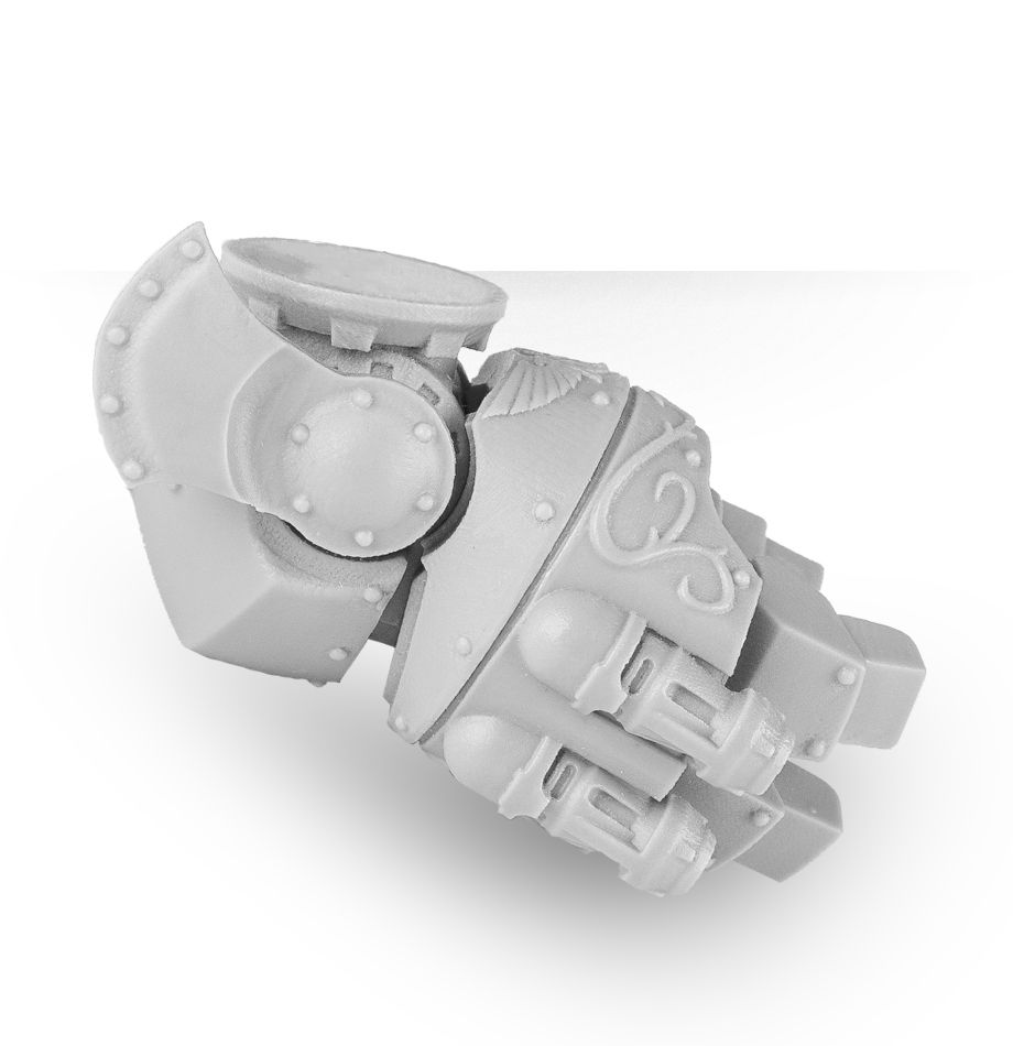 This 12-part resin kit allows you to build 1 Telemon Caestus, which can be assembled with fist open or closed. The ornate armour work includes an Aquila motif, and two fans are included, meaning the Caestus can be mounted on your choice of left or right arm.