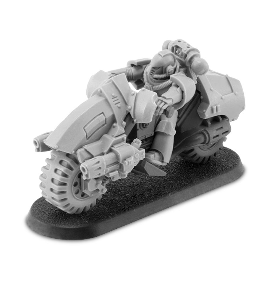 This multipart resin and plastic kit builds three Legion Outriders – bike-mounted Space Marines clad in Mark IV power armour. The kit includes two