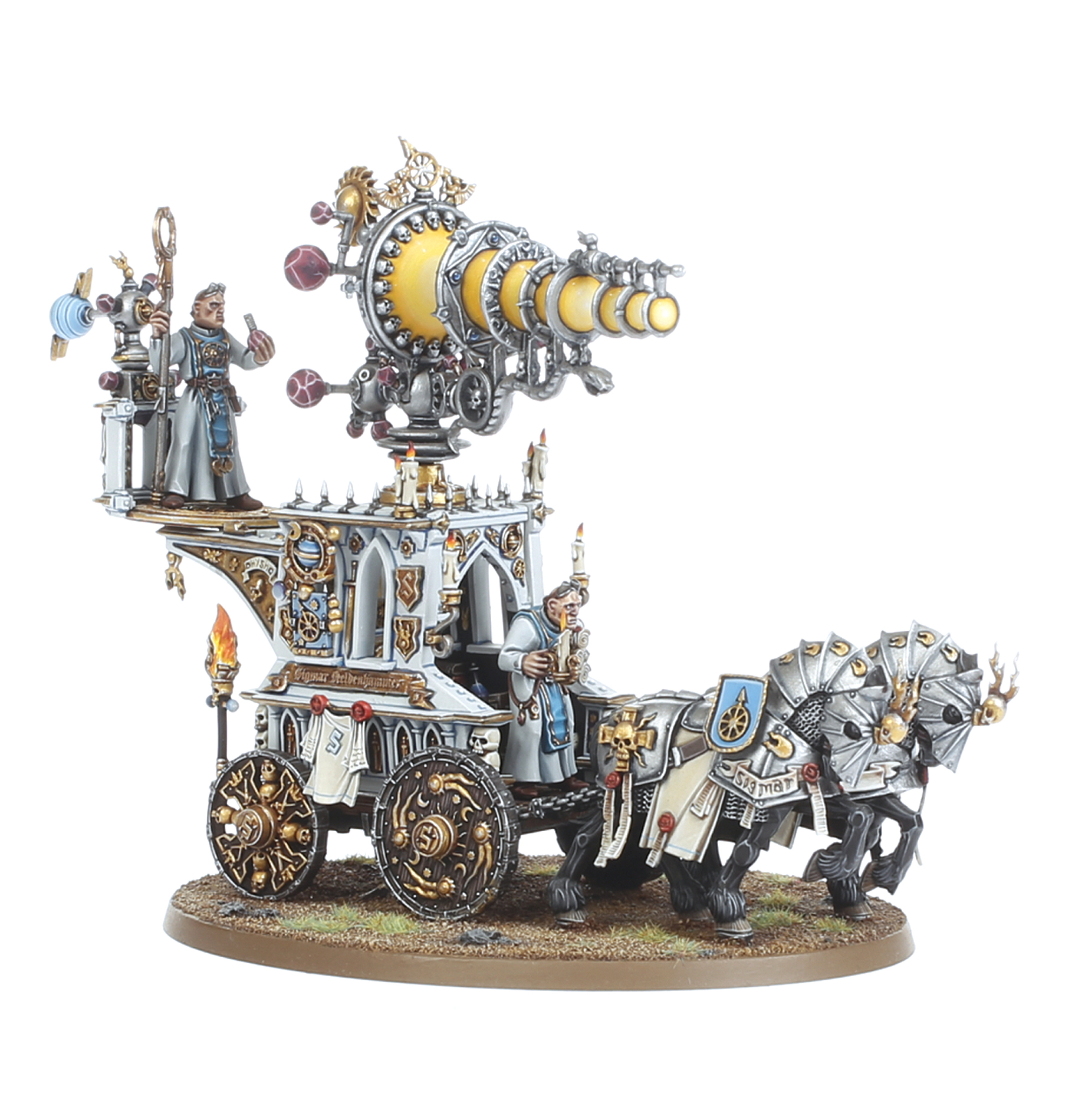 Battlemages require arcane foci and esoteric machinery to channel their sorcerous powers. They often use celestial orreries, etheric lenses and the like to work their spells, even bringing these ponderous devices into battle atop ornate carriages. The Luminark of Hysh is one such device, focusing light through arcane optics to emit a searing beam that vaporises anything in its path. The Celestial Hurricanum is another, capable of summoning a raging storm.