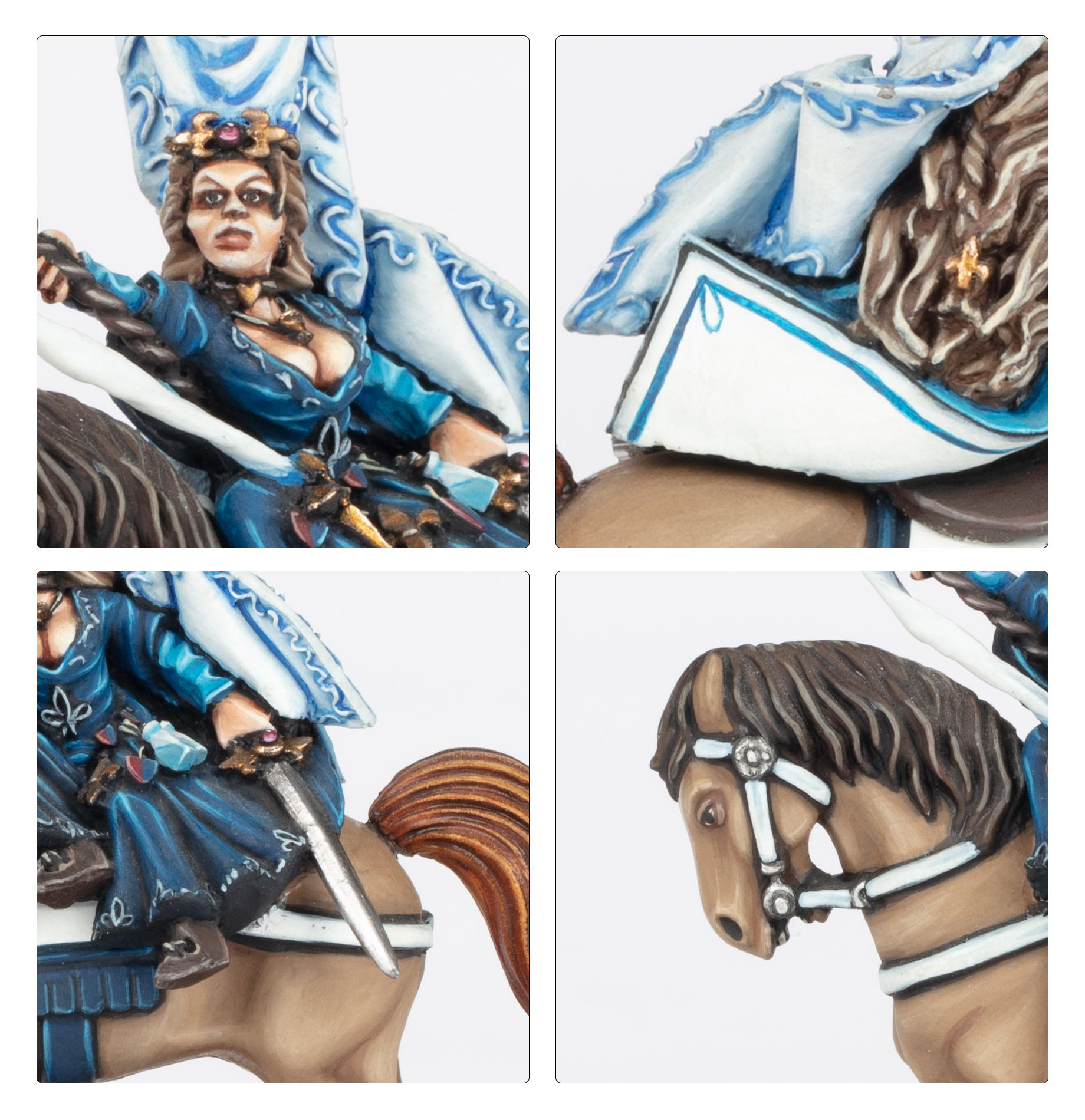 Prophetesses of the Lady are amongst the mightiest magic-wielders in the Kingdom of Bretonnia, tutored from a young age by the handmaidens of their goddess. When battle calls, the Prophetesses rally to Bretonnia’s defence, whether mounted atop fine chargers or taking caution on foot. They use their mystical powers to lend protection to the noble warriors of the dukedoms, warding away foul enemy magics and striking down the foe with their own potent spells.