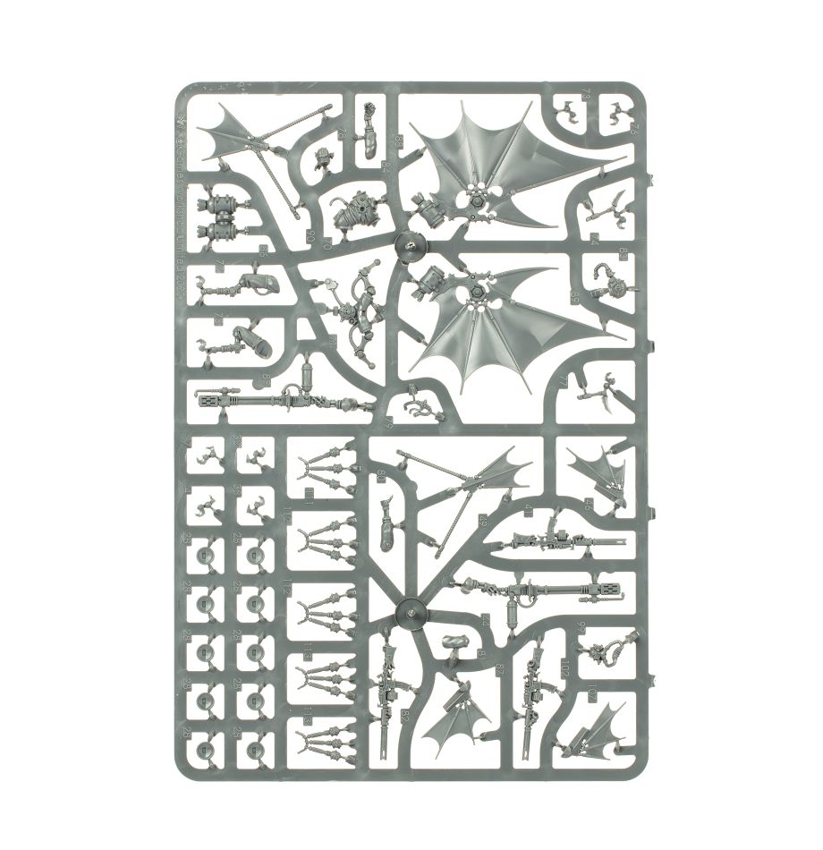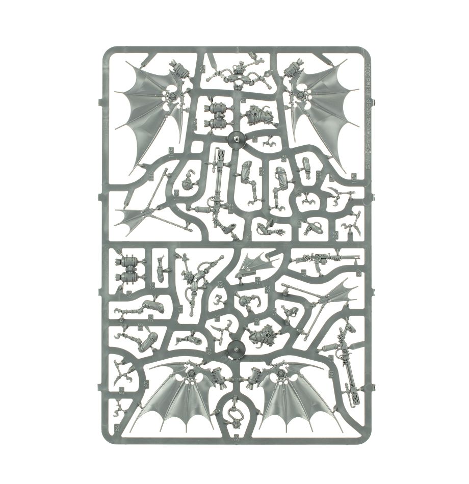 One of many specialised castes of cyborg warriors available to the Adeptus Mechanicus, the Pteraxii are optimised for instinctive reaction and agility. Pteraxii’s reflexes are accentuated by paring back elements of cogitation that impede their primary function. Implanted with additional limbstumps – scapuli superior – on their back, a flight pack of thrusters and reactive life surfaces is connected to them. The flight packs become part of the Pteraxii, who serve in several roles. Sterylizors are honed for aggression, and their legs end in vicious, spur-like talons. They scour cavernous forge