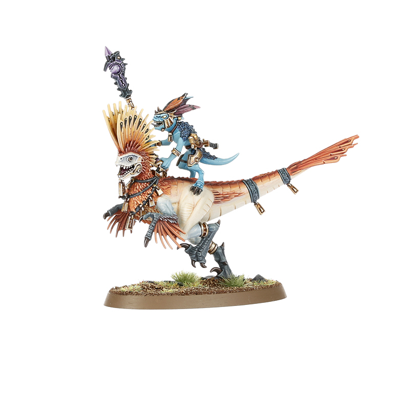 Raptadon Chargers are revered as holy paladins of Tepok, ruler of all things mystical – fanatical skinks riding quick-witted raptadon steeds, armed with arcane weapons taken from the depths of the Inscrutable One’s temples. These relics glow with potent energies that can melt clean through armour, drawing on geomantic power to intensify each strike.