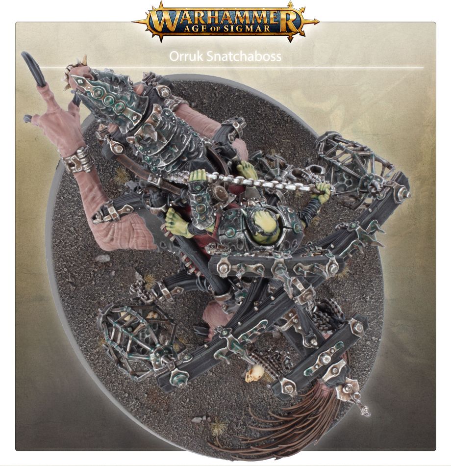Only the wiliest of Snatchabosses have the know-how to capture a sludgeraker beast. Despite their size, these formidable carnivores employ stealth to stalk the swamps for prey, lurking in the mire and carefully staying upwind of their mark to hide their unimaginable stench. In battle, they are deceptively swift, loping forward as the cages and chains of the Snatchaboss rattle and clank above the din of combat, a grim chiming that strikes fear into the hearts of those who hear it.