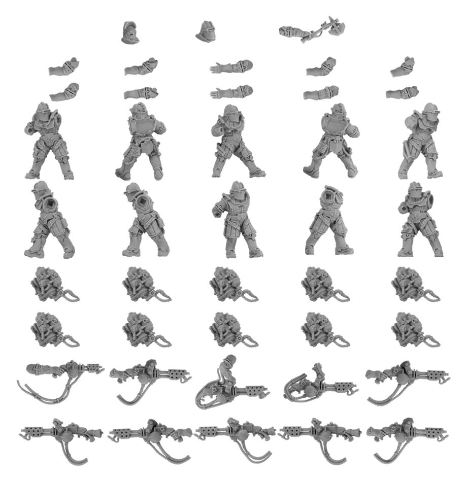 Working in conjunction with Lasrifle Sections, the Solar Auxilia Flamer Section provides close quarters support to their Infantry Tercio. Whether advancing on lightly armoured enemies, assaulting occupied bunkers or entrenched behind Aegis Defence Lines, the gouts of promethium flame from their weapons will drive back foes far greater than them in number. They are also often employed in boarding actions, clearing corridors of ships with ease.