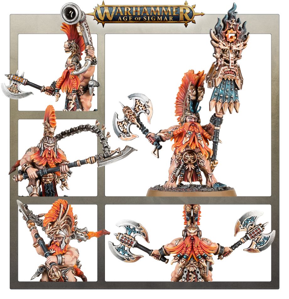 The lives of the Fyreslayers revolve around battle, for these grizzled duardin mercenaries will fight on behalf of any who meet their price in gold. Renowned for their fearsome tempers and unrivalled martial skills, the Fyreslayers seek treasure to gather the essence of their long-lost deity, Grimnir. Inspired by Battlesmiths bellowing the deeds of their forebears, stalwart Hearthguard warriors and unyielding Vulkite Berzerkers charge into battle, craving glory and gold alike.