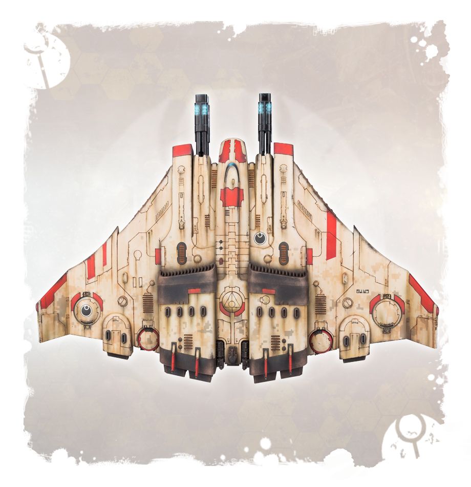 During the Taros campaign, the T’au deployed a new variant of its Tiger Shark fighter-bomber. Codified as the AX-1-0, this heavily armed aircraft replaced its drone racks and ion cannon with two heavy rail cannons and a seeker missile array. These massive weapons, usually mounted on the far larger Manta, turn the Tiger Shark into a formidable ground attack craft.