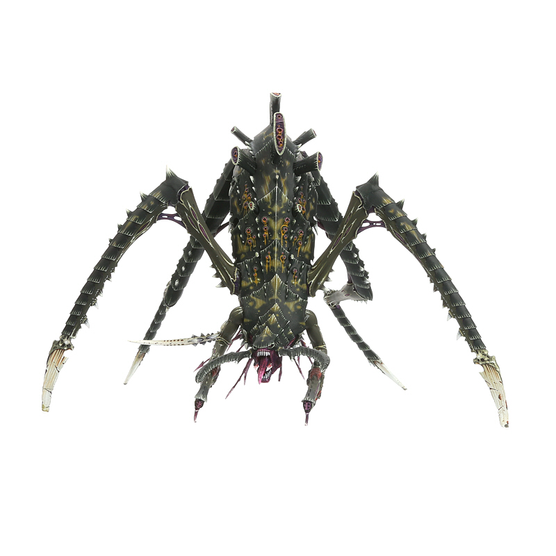 Hierophants are among the most famous and feared of the Tyranid bio-titans, gargantuan creatures grown and adapted to rival the largest war machines of other species. Scuttling across the battlefield on vile, spiny legs capable of skewering an armoured tank, a Hierophant is a horrifying spectacle for any enemy to face. Looming over its prey, this horrifying apex beast vomits a torrent of bio-plasma and living ammunition that reduces entire formations to a half-digested organic slurry. Shrouded in toxic spores and protected from all but the heaviest weapons by its thick chitinous plating, the
